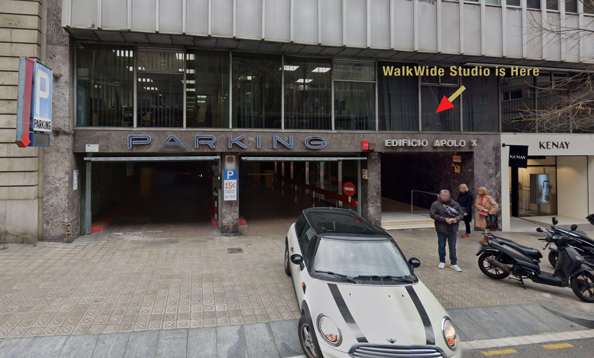 Enter through the glass doors next to the parking entrance (EDIFICIO APOLLO X)